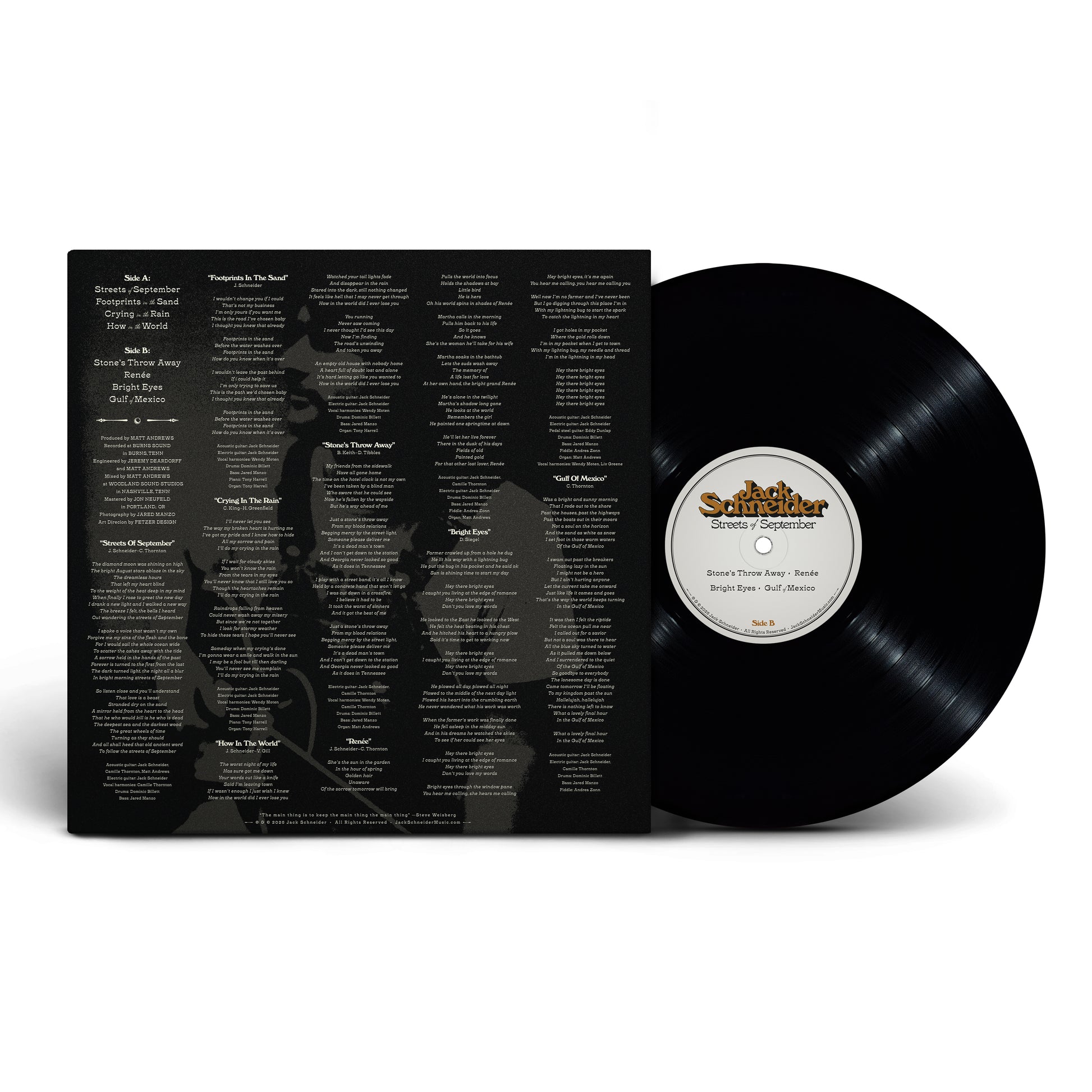 Born from a string of unlikely coincidences, chance encounters, and surprise reunions, Jack Schneider’s stirring new album, Streets of September, is more than just a work of serendipity, it’s a deeply personal reflection on growth, change, and mortality from a master craftsman with an almost religious reverence for words and music. The songs are warm and timeless, harkening back to ’70s troubadours like James Taylor and John Denver, and the performances are raw and spacious, captured live to tape with producer/engineer Matt Andrews (Gillian Welch, Old Crow Medicine Show, Dawes) and an all-star band. The result is a touching tribute to the people and places that shaped Schneider’s journey over the last ten tumultuous years, a meant-to-be mixture of profoundly honest original material and revelatory interpretations that stand as a testament to the enduring power of storytelling in the face of loss and transcendence.
